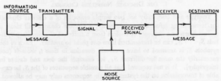 커뮤니케이션의 근본적인 문제는 다른 지점에서 선별된 하나의 메시지를 한 지점에서 정확히 혹은 근사치에 가깝게 재생산하는 것에 대한 문제다. 메시지는 흔히 의미를 가지곤 한다. 즉, 메시지는 특정한 물리적 혹은 개념적 개체를 나타내거나, 혹은 어떤 시스템에 따라 그 개체와 연관성을 가지게 된다. 커뮤니케이션의 이런 의미론적 측면은 공학적 문제와 무관하다.52