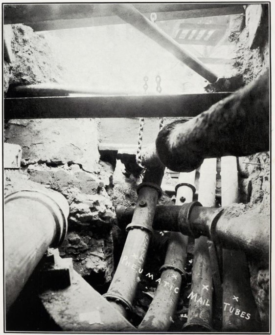 용기가 다음 정거장으로 전진하게 만들거나, 여분의 기압을 통해 왔던 정거장으로 되돌아가게 하려고 노력한다. 만약 이 방법이 실패하면, 도로가 갈기갈기 찢어져야 할 가능성이 높다. … 브루클린 다리의 뉴욕 터미널에서는 일부 굴착 공사로 인해 한 차례의 파손이 발생하기도 했다. 이 경우에는 파이프를 찢어서 그것을 중계(relay)해야 할 필요가 있는 것으로 나타났다. (New York Herald, 1909)