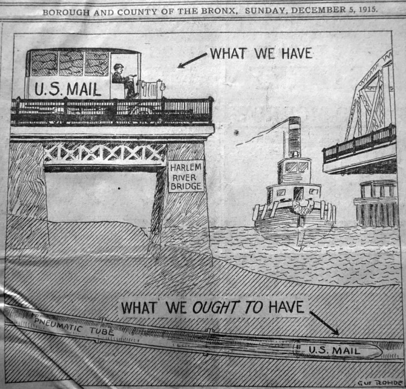스타크는 뉴욕 거리 아래에 기송관 시스템이 얼마나 광범위하게 있는지 알고 놀랐다. 이 관들은 1900년대 초 도시에 있는 거의 모든 우체국을 연결했으며, 사람들의 집에 직접 배달되기 전에 우편물을 가지러 걸어가야 하는 사람들을 수용하기 위해 최소 12 블록마다 우체국 정거장이 위치해 있었다. 이 관들은 맨해튼을 브루클린의 중앙 우체국과 연결하는 브루클린 다리를 가로질러 운용되는 관을 통해 맨해튼 너머로 뻗어나갔다.