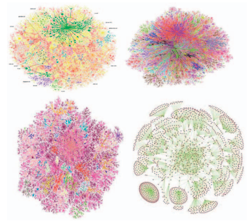 독자들은 다행히도 앞서 맥크리스탈의 지도에 행해졌던 같은 종류의 정밀조사를 피하게 되겠지만, 오늘날 ‘인터넷 지도’를 광고하는 데 이용 가능한 무수히 많은 이미지들 (그림2), 혹은 ‘인간 신경망 지도’, 혹은 더 나아가 우리가 봤던 것과 같은 ‘아프가니스탄에서의 미군 전략 지도’에 뚜렷한 획일성이 존재한다고 말하는 것만으로 충분하다. 거점 노선 운항 방식(hub-and-spoke)의 클라우드 미학이 지배적이다. 미세한 가지 구조가 함께 군집해 복잡한 3차원 공간을 형성한다. 노드들은 링크들에 의해 연결된다. 작은 모세혈관들이 더 큰 동맥에 합병되어 흐름과 흐름에 대한 금지를 통치하는 거대한 계층 구조를 직조한다. 하지만 이 모든 과정을 거치면서도, 지도의 가독성(legibility)은 의심스러울 정도로 편향적이고, 심지어 이데올로기적으로 동기 부여되어 있는 것으로 남는다. 관찰자는 디지털 궁창(firmament)에 대한 모호한 특정 우주론적 ‘사실들’을 직관할 수 있는 반면에 (명백히 정보는 군집하기를 좋아한다; 저마다의 색을 가진 이런 집단 거주지는 섞이지 않은 채로 영속한다; 우리는 결국 나무를 사랑한다), ‘토대 위의 사실들’에 대해서는 거의 얻는 바가 없을 것이다 (누가 연결하고 누가 연결하지 않는지; 프로토콜논리적인 소프트웨어와 독점적인 소프트웨어 사이의 네트워크-내부의 투쟁들; 피라미드 계층구조의 물화; 무지불 미세노동의 화폐화). 그러므로 필자가 여기서 제안하고 있는 것은, 쉬운 말로 하면, 모든 인터넷 지도가 동일하게 보인다는 것이다. 모든 소셜 그래프의 시각화는 동일하게 보인다. 워드 클라우드(word cloud, 단어 시각화)는 순서도와 같고 순서도는 인터넷 지도와 같다. 모든 것이 미학적 코드들의 하나의 단일하고 균일한 집합 내부에서 작동한다. 이런 미학적 공간의 크기는 1(하나)이다.