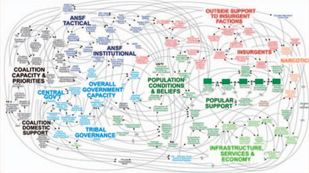 2010년 봄, 뉴욕타임즈는 스탠리 맥크리스탈(Stanley McChrystal) 장군과 여타 군사 및 정부 관계자들의 회동으로부터 발췌한 파워포인트 슬라이드 하나를 1면에 게재했다. 이 슬라이드는 아프가니스탄에서의 미국의 군사 전략을 힘과 관계들에 대한 거대한 도표(diagram)의 형식으로 묘사한다. 놀라운 데이터 시각화인 이 슬라이드는 철저하게 상세하다. ‘부족 자치(Tribal Governance)’ 그리고 ‘반군들(Insurgents)’과 같은 어구와 함께 제시된 120개의 노드들(nodes)은 아주 많은 선과 화살표들과 함께 연결된다. [역자 설명: 네트워크에서 노드는 네트워크 상의 하나의 ‘점’을 의미하고, 이 점들 사이의 관계를 나타내기 위해 연결하는 선을 ‘엣지’라고 말한다. 앞으로 이 둘은 점이나 선으로 번역하지 않고 음역한다.] 순서도(flow chart)와 같이, 이 선들은 영향력의 연결고리(links)를 예시한다. 글꼴의 크기는 각 텍스트 제목의 상대적 중요성을 나타낸다. 색으로 칠해진 군집들(clusters)은 정부, 연합군, 인구, 반란군과 같은 주제들에 기반하여 광범위한 구역들을 표기한다. 하지만 단어와 연결들의 광포함은 눈을 압도하기 시작한다. 슬라이드가 전달하려고 의도한 바가 무엇인지 혹은 실제로 어떤 것이든 전달하려는 의도가 있는지조차 불분명하다.